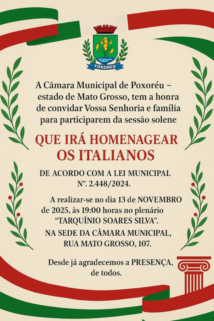 A CÂMARA MUNICIPAL DE POXORÉU, por meio de seu Presidente, Vereador Leônidas Machado Barcelos, no uso de suas atribuições legais, CONVOCA a sociedade Poxorense e todos os interessados para participarem da AUDIÊNCIA PÚBLICA, a realizar-se no dia 19 de setembro de 2025, às 09h00, no Plenário das Deliberações Tarquínio Soares Silva, situado na Rua Mato […]